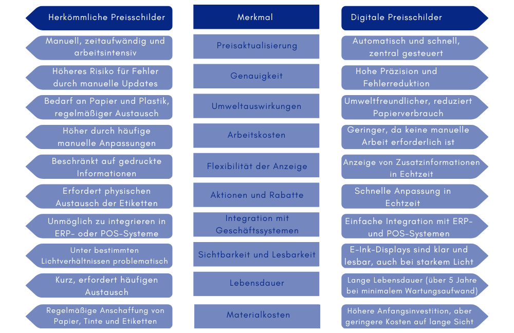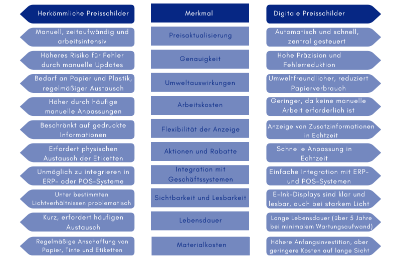 All das zusammen führt zu Kostensenkungen, höherem Umsatz und gesteigerter Effizienz! Viele weitere Vorteile sind natürlich individuell und hängen von der jeweiligen Art des Geschäfts ab. Weiter unten sehen Sie das Vergleichsdiagramm von ESL und herkömmlichen Papierpreisschildern.